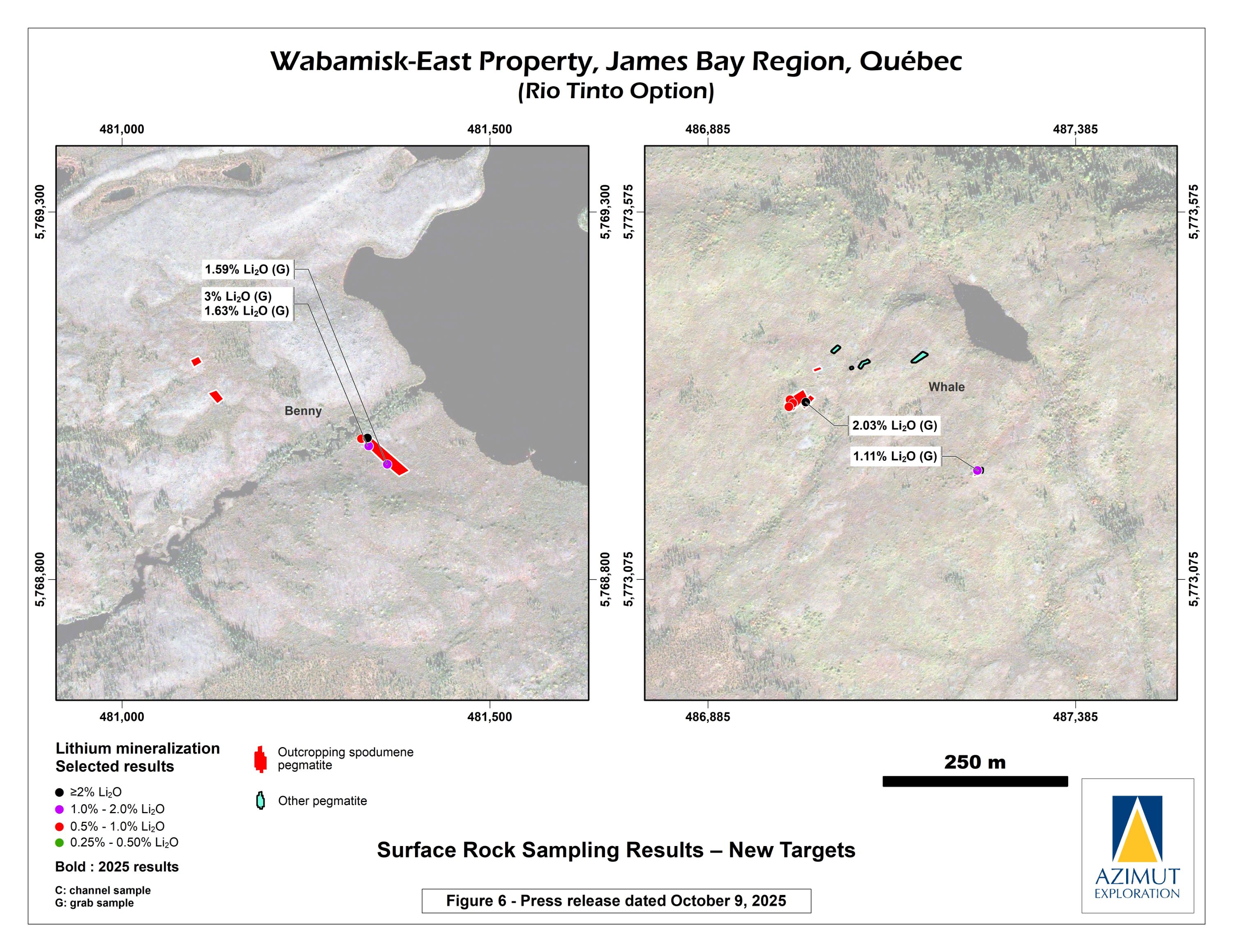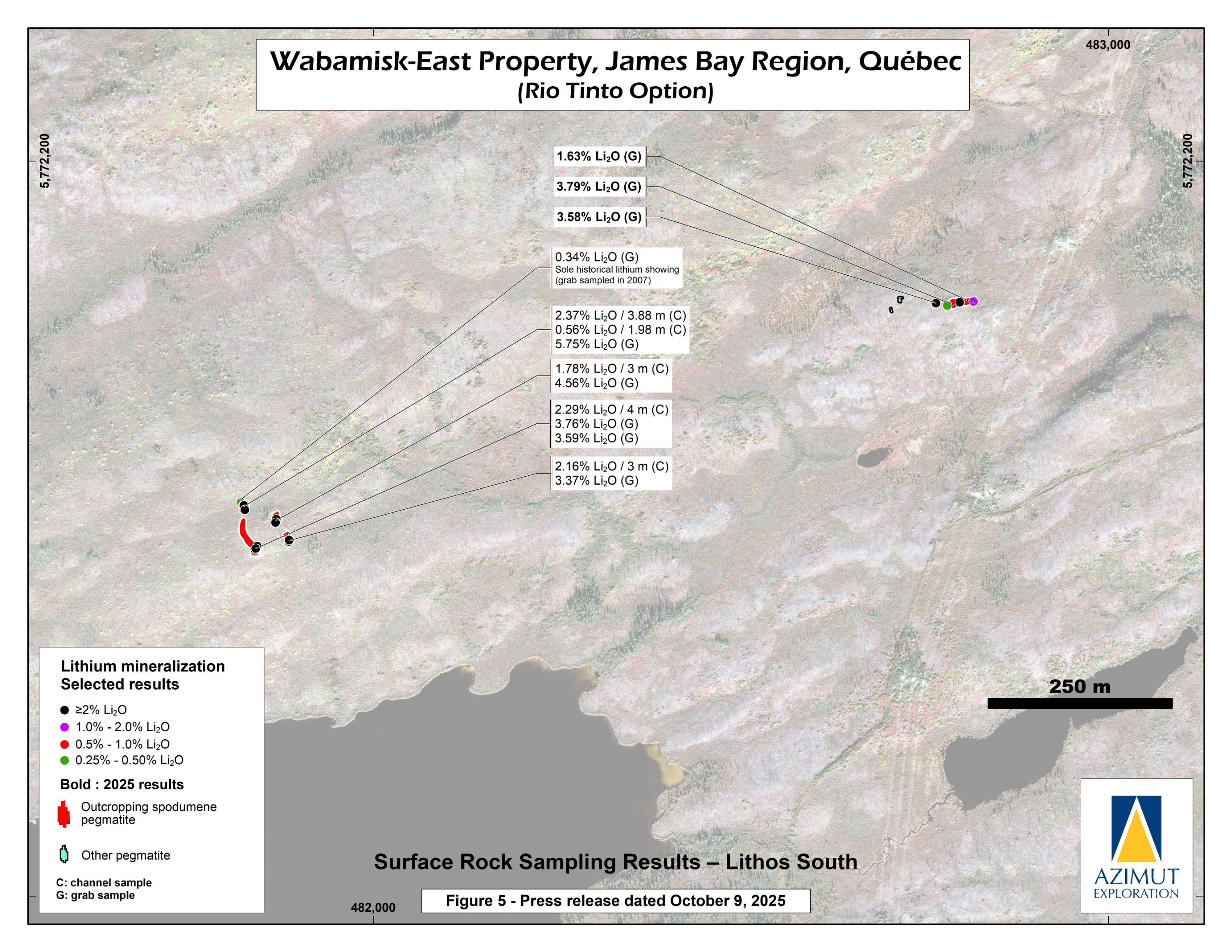 Since regaining full control of the Property, Azimut reprocessed the property’s large database to rank exploration targets. The 2024 prospecting program revealed an antimony-rich system but also a strong potential for lithium, with an extensive spodumene pegmatite field identified.